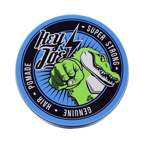 Embalagem redonda azul com texto e ilustração de crocodilo verde apontando