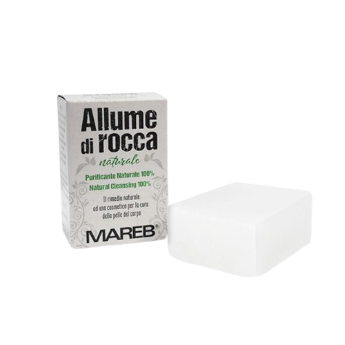 Sabão branco sólido e embalagem com texto Allume di Rocca naturel