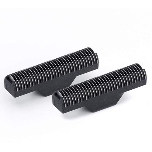Duas lâminas pretas para máquina de barbear com design em espiral e partes metálicas visíveis