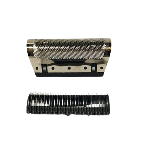 Peças para máquina de barbear, lâmina metálica prateada e tela preta em fundo branco