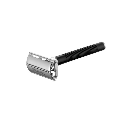 Aparelho de barbear clássico preto e cromado sobre fundo branco