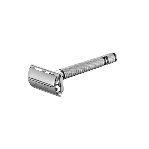 Aparelho de barbear clássico em metal prateado com cabo texturizado.