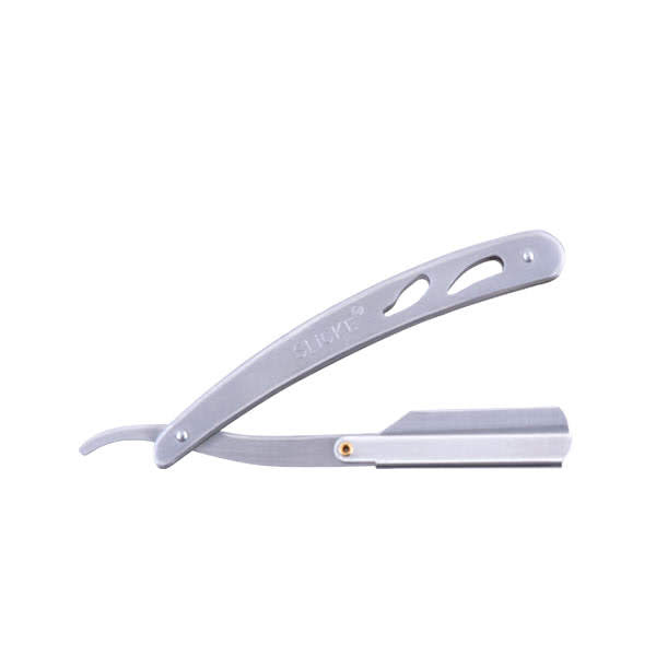 Navalha de barbear cinzenta com cabo metálico e recortes ovais