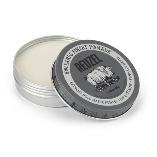 Pote metálico prateado com pomada branca e tampa rotulada Reuzel com porco e textos de pomada matte