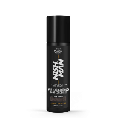 Embalagem preta de corretor de raízes para cabelo cor castanho escuro, com texto branco e dourado