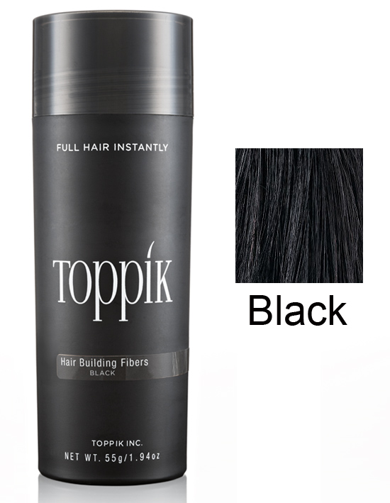 Frasco preto de produto Toppik com texto branco e amostra de cor branca